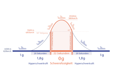 Das Parabelflugmanöver bei einem Zero G-Flug besteht aus drei Phasen: Eintrittsphase in die Parabel, Parabel und Austrittsphase aus der Parabel.